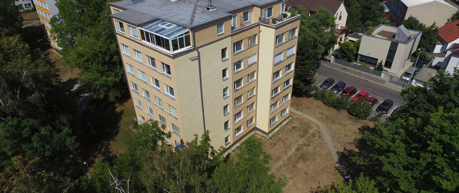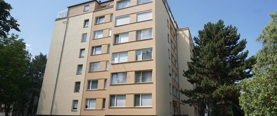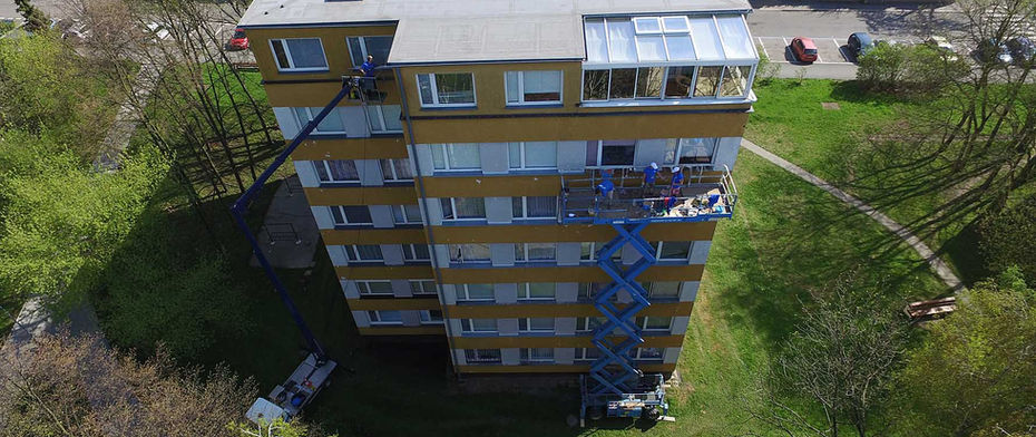 Čištění a dezinfekce silně infikované zateplené fasády organickými nečistotami. Následná vysprávka trhlin v omítkovině. Fasáda byla ošetřena silikonovým renovačním nátěrem. Realizace byla provedena z nůžkové plošiny.